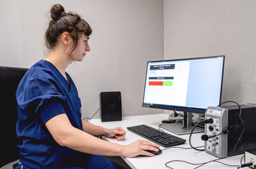 Patiënten met stemproblemen gaan naar de stemcabine. Daar breng ik hun stem in kaart via een professionele microfoon en speciale computerapparatuur.