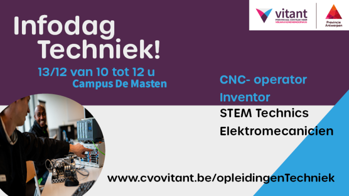 Op zaterdagen 13 december '25 en 24 januari '26 kan je kennismaken met de technische opleidingen die je kan volgen in het volwassenenonderwijs bij CVO Vitant. Je bent welkom van 10 tot 12u op Campus De Masten in Kapellen. Zie onze cursisten aan het werk, stel al je vragen aan onze lesgevers en volg een rondleiding langs onze praktijklokalen.