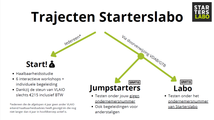 Starterslabo is een organisatie die mensen ondersteunt bij het opstarten van hun eigen onderneming. Het richt zich vooral op startende ondernemers die een idee hebben, maar nog begeleiding nodig hebben om dit om te zetten in een levensvatbare zaak. Het doel van Starterslabo is om mensen op een veilige manier te laten ondernemen, vaak met behoud van uitkering of in een gesubsidieerd kader (via VLAIO), zodat ze zonder grote financiële risico’s kunnen starten.