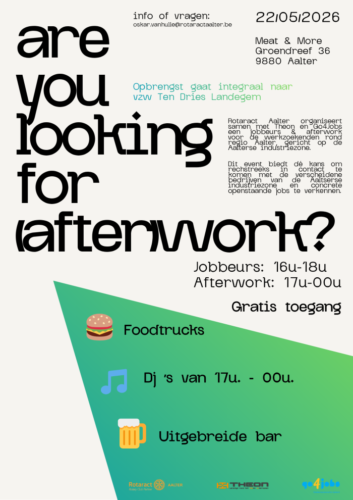 Rotaract Aalter organiseert i.s.m. Theon en Go4Jobs een jobbeurs op de terreinen van Meat & More in Aalter (ingang recht tegenover Groendreef 37). De jobbeurs vindt plaats van 16u tot 18u.