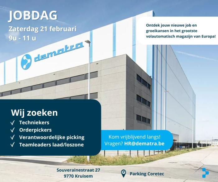 Ben jij op zoek naar een nieuwe uitdaging in een innovatieve logistieke omgeving? Of ken jij iemand die op zoek is? Kom dan vrijblijvend langs tijdens onze jobdag en ontdek de mogelijkheden binnen Dematra.
