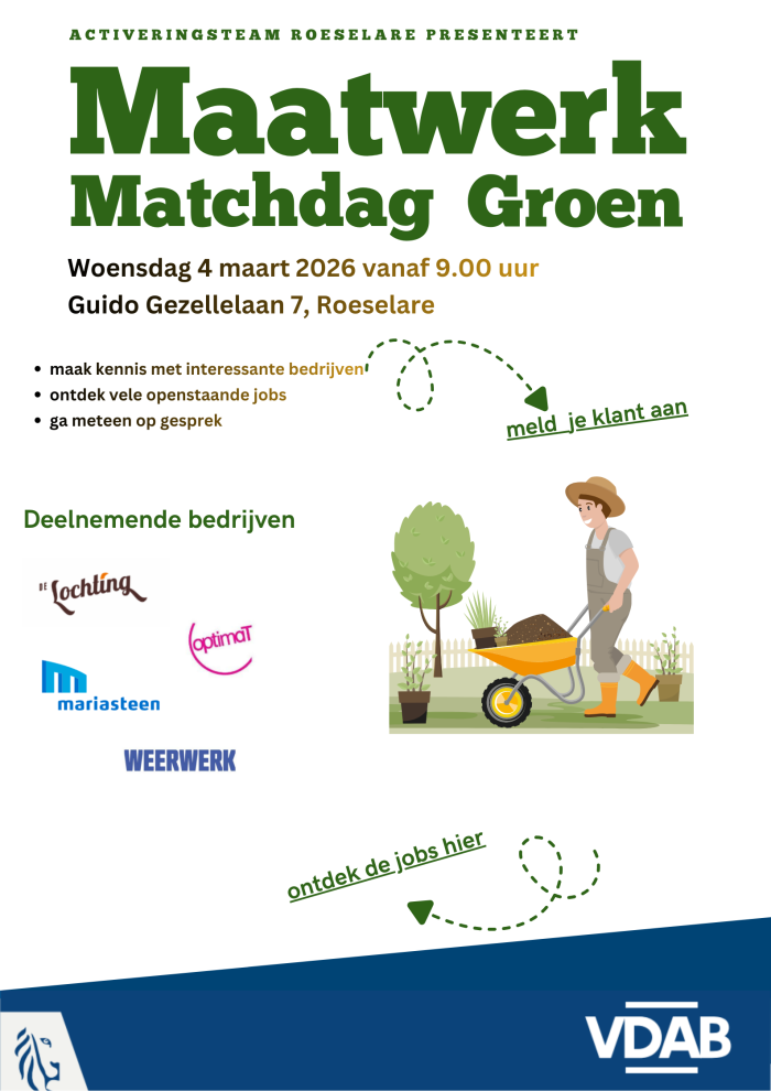 Voor kandidaten met advies collectief maatwerk met groene vingers is er de maatwerk matchdag GROEN. Je kan er kennis maken met de maatwerkbedrijven regio Roeselare en al solliciteren op vacatures.