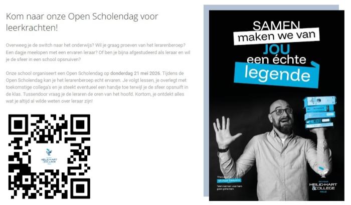 Het Heilig-Hart&College Halle organiseert een Open Scholendag op donderdag 21 mei 2026. Tijdens de Open Scholendag kan je het lerarenberoep echt ervaren. Je volgt lessen, je overlegt met toekomstige collega’s en je steekt eventueel een handje toe terwijl je de sfeer opsnuift in de klas. Tussendoor vraag je de leraren de oren van het hoofd. Kortom, je ontdekt alles wat je altijd al wilde weten over leraar zijn!