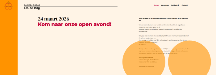 Drukkerij EM de Jong is gevestigd in Baarle-Nassau, letterlijk op de grens tussen Nederland en Vlaanderen. Werkzoekenden, baanveranderaars en studenten uit de omgeving van Baarle-Nassau (dus Baarle-Hertog, Hoogstraten, Turnhout, Meer, Brecht) zijn van harte welkom op 24 maart. Je krijgt een rondleiding door het bedrijf en de gelegenheid om met medewerkers in gesprek te gaan en je interesse kenbaar te maken.