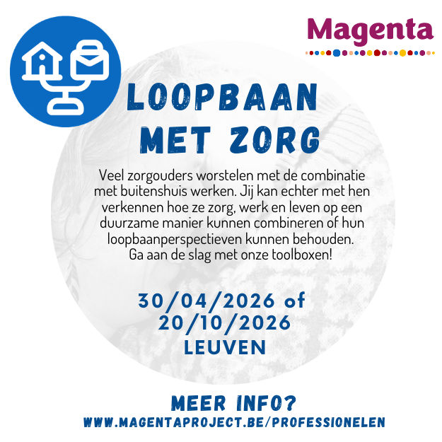 De zorgsituatie is een realiteit waar veel loopbaancoaches niet mee vertrouwd zijn. De werksituatie ligt vaak buiten het vizier van zorgprofessionals zoals (gezins)begeleiders, psychologen/pedagogen,... Jij kan echter met ouders verkennen hoe ze zorg, werk en leven op een duurzame manier kunnen combineren of hun loopbaanperspectieven kunnen behouden.