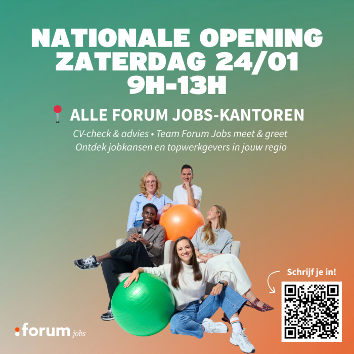 Tijdens onze algemene zaterdagopening ben je welkom in elk Forum Jobs-kantoor voor een laagdrempelig en vrijblijvend bezoek.