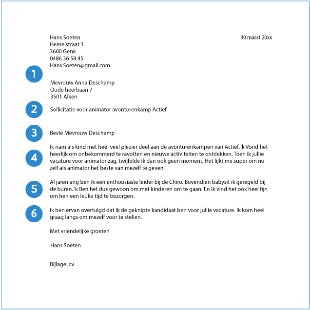 Vermeldt de vacature een contactpersoon? Spreek die dan rechtstreeks aan met mevrouw of meneer gevolgd door de familienaam.