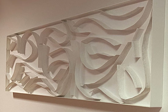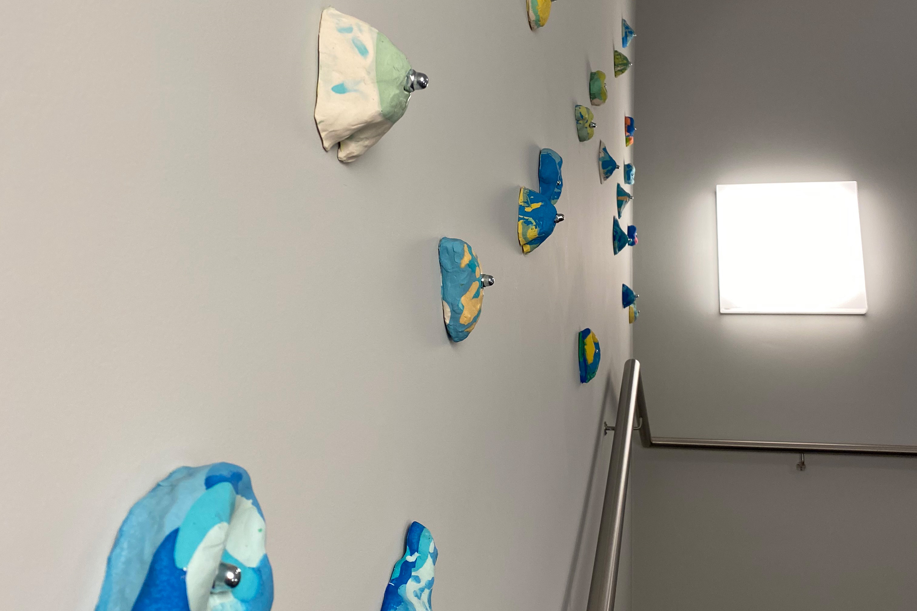Op de eerste en tweede verdieping vind je kunstwerken die een link hebben met de opleidingen die daar doorgaan. Op de eerste verdieping brengt een op hand gedragen bloem ode aan de zorgsector. Op de tweede verdieping zetten we ‘business support’ in de kijker door een organische vorm waaruit inspirerende woorden groeien. Het KunstBaan-team deed aan creatieve recyclage: de wandsculpturen zijn volledig opgebouwd uit oude kartonnen rolletjes en simuleren een 3D-effect wanneer je er wandelt.