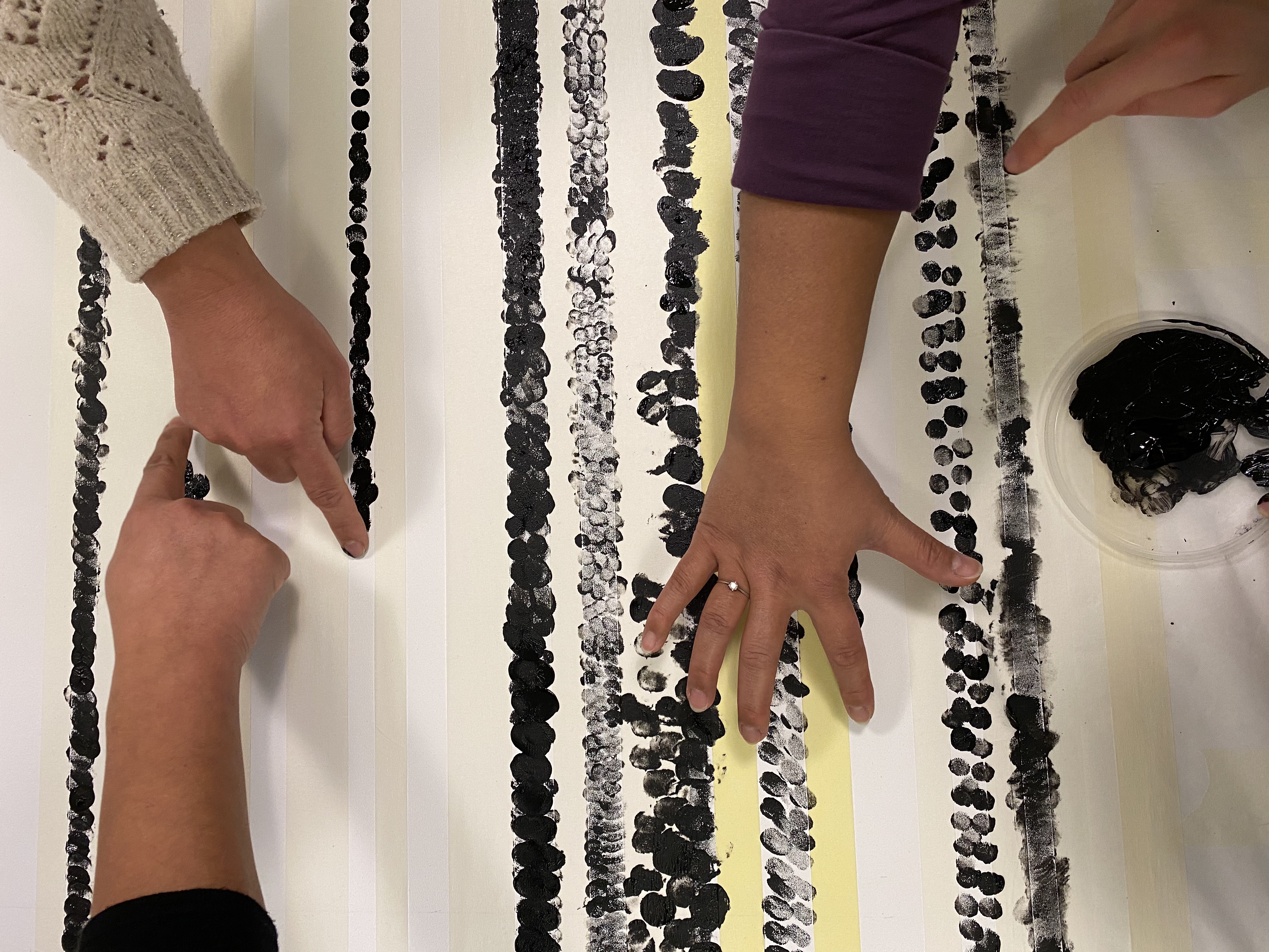 In de lounge hangt een grote streepjescode aan de wand. Als je dit werk van dichtbij bekijkt, zie je dat de code is opgebouwd uit ontelbare vingerafdrukken. Die werden gemaakt door het KunstBaan-team, samen met cursisten en instructeurs uit de opleiding verkoop. Want net zoals elk product een unieke code draagt, beschikt elk individu over een unieke vingerafdruk: jij bent uniek!
