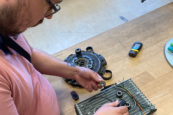 Hier zie je een weefsel dat niet alleen elektriciteits- en koperdraad verbindt. Tijdens het creatieproces verbond het ook de medewerkers van VDAB met het KunstBaan-team. Zij vonden elkaar in gezamenlijke creatieve sessies en vormden uit kleine beetjes materiaal een sterk en kleurrijk wandtapijt.