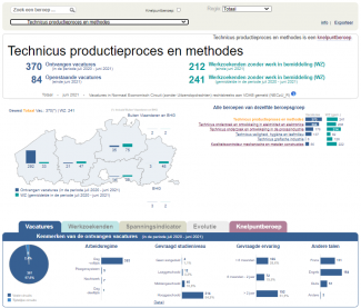 - In Beroepen in Cijfers wordt per beroep een overzicht gegeven van het aantal ontvangen en openstaande vacatures enerzijds, en het aantal werkzoekenden zonder werk 'in bemiddeling' anderzijds.